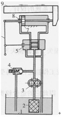 1-油箱2-過濾器3-液壓泵4-溢流閥5-伺服閥6-操縱手柄7-活塞8-液壓缸9-工作臺