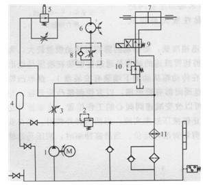 1-定量液壓泵;2-溢流閥;3-節(jié)流閥;4-蓄能器;5-減速閥;6-雙向定量馬達(dá); 7-雙桿液壓缸;8-單向節(jié)流閥;9-=位四通電磁換向閥;10-減壓閥;11-冷卻器
