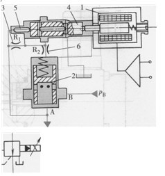 i-比例電磁鐵2-主閥心3、6-不可調(diào)節(jié)流閥4-先導(dǎo)閥心5一壓力反饋推桿