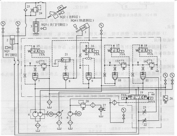 1-主液壓缸;2-門缸;3-門閂缸;4-雙聯(lián)液壓泵;5-變量液壓泵;6-定量液壓泵; 7、8、9、10、11-插裝閥;12、13、14-先導(dǎo)調(diào)壓閥;15、16、17、18-=位二通電磁換向閥;19-三位四通電液換向閥;20-溢流閥;21-先導(dǎo)單向閥;22、23-節(jié)流閥;24-直動(dòng)溢流閥;25-單向閥;26-壓力繼電器;27-冷卻器