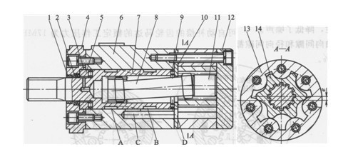l,2,3-密封;4一前蓋;5-止推環(huán);6-殼體;7-配流軸(輸出軸);8-花鍵聯(lián)軸器;9-止推軸承;10-輔助配油板;11一限制塊;12一后蓋,13 -定子;14-擺線轉(zhuǎn)子;A,B-橫槽;C,D-孔
