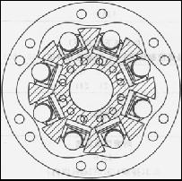 如圖所示,馬達(dá)旋轉(zhuǎn)缸體帶8個(gè)柱塞,內(nèi)曲線環(huán)由6個(gè)作用段組成。馬達(dá)柱塞上滾輪受來(lái)自于泵的壓力油作用,沿定子內(nèi)曲線環(huán)運(yùn)動(dòng)進(jìn)而完成馬達(dá)吸/排油,實(shí)現(xiàn)泵側(cè)的輸出液壓能轉(zhuǎn)換為馬達(dá)側(cè)的輸出轉(zhuǎn)矩。