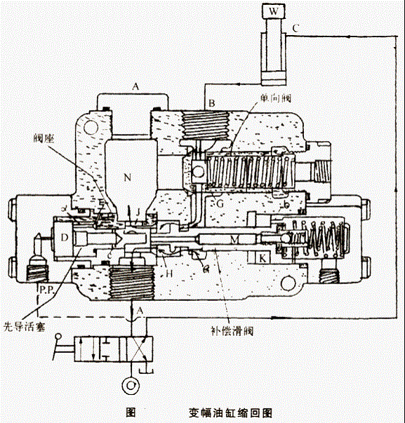 平衡閥安裝在變幅油缸的支撐油路上,是用以防止變幅下降速度因載荷重力作用大于供油量所決定的速度。該閥的結(jié)構(gòu)作用如下圖所示,在閥體內(nèi)裝有補(bǔ)償滑閥和單向閥。補(bǔ)償滑閥由彈簧的壓力和作用于先導(dǎo)活塞的液控壓控制。