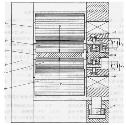 圖1所示為板帶軋鋼機(jī)彎輥及平衡裝置的工作示意圖。圖中1為被軋板帶,2為機(jī)架,3為上工作輥,4為下工作輥,5為上支承輥,6為下支承輥,10為支承輥平衡液壓缸。正彎輥液壓缸8所產(chǎn)生的正彎輥力F1的方向與負(fù)彎輥液壓缸9所產(chǎn)生的負(fù)彎輥力F2的方向是相反的,所以這兩組液壓缸是根據(jù)板型偏差控制的要求,分別施加但不同時(shí)施加力F1和F2。改變彎輥液壓缸的工作壓力就可對(duì)彎輥力進(jìn)行連續(xù)控制。工作輥平衡力F3的方向和正彎輥力F1的方向是一致的,只是平衡力遠(yuǎn)小于彎轉(zhuǎn)力。只要將控制正彎輥力的液壓力降低,正彎輥液壓缸就起到平衡缸的作用。在穿帶操作時(shí),所有彎輥液壓缸的有桿腔和無(wú)桿腔都引入低壓油,使工作輥處于有阻尼的浮動(dòng)狀態(tài)。