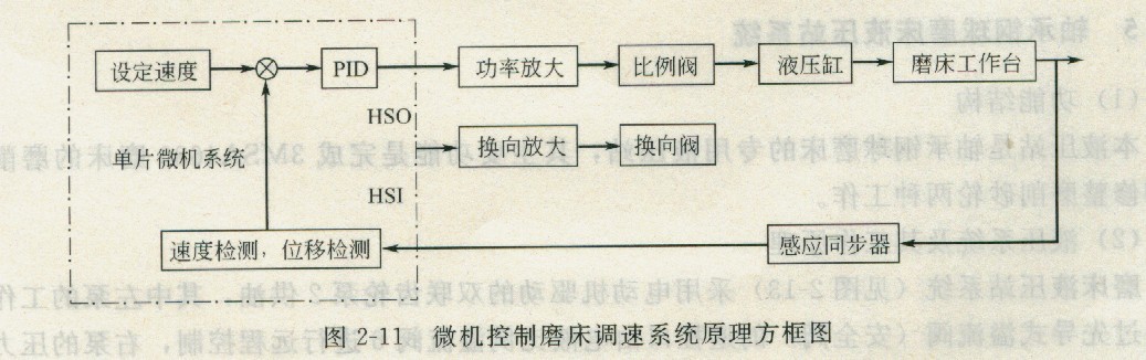 圖2-11所示為微機(jī)控制磨床調(diào)速系統(tǒng)的原理方框圖。其工作原理為:?jiǎn)纹C(jī)的速度設(shè)定信號(hào)與感應(yīng)同步器、檢測(cè)儀表的反饋信號(hào)相比較得出的誤差信號(hào)經(jīng)控制算法將控制信號(hào)由D/A轉(zhuǎn)換器輸出,功率放大器進(jìn)行V/l轉(zhuǎn)換后,通過(guò)控制比例調(diào)速閥開(kāi)度大小,使液壓泵的壓力油進(jìn)入液壓缸推動(dòng)磨床工作臺(tái)運(yùn)動(dòng),感應(yīng)同步器再將工作臺(tái)速度(或位移)信號(hào)反饋給微機(jī)系統(tǒng),從而成一個(gè)閉環(huán)控制周期。而工作臺(tái)的換向由微機(jī)I/0控制電液換向閥實(shí)現(xiàn),與速度閉環(huán)控制回路相配合,通過(guò)感應(yīng)同步器對(duì)工作臺(tái)行程的同步檢測(cè),設(shè)定適當(dāng)?shù)膿Q向提前量,可很好地實(shí)現(xiàn)換向效果。兩者相配合,也可很好地實(shí)現(xiàn)工作臺(tái)的柔性停機(jī)。