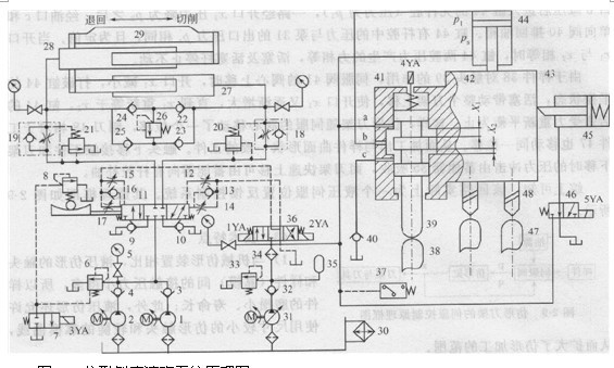 潑回路的執(zhí)行器為驅(qū)動(dòng)仿形刀架43的閥控缸。仿形刀架43和仿形液壓缸44的活塞桿、伺服閥41的閥套以及刨刀 48連成整體,伺服閥41的閥心和觸頭39連為一體,彈簧42使觸頭和樣件(俗稱靠模)38緊密接觸。二位三通電磁換向閥46用于控制夾緊液壓缸45的動(dòng)作方向,夾緊缸與仿形刀架油路成互鎖關(guān)系,即只有在缸45松開(kāi)時(shí),仿形油路才能工作。仿形刀架回路由變量泵31供油,其最高壓力由溢流閥33設(shè)定,單向閩32用于防止油液倒灌;精過(guò)濾器用于提高油液的清潔度;蓄能器35用于吸收壓力沖擊和補(bǔ)油。