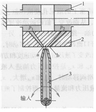 圖6-41所示為射流管裝置的工作原理。它由射流管3、接受板2和液壓缸1組成。射流管3可繞垂直于圖面的軸線左右擺動一個不大的角度。接受板2上有兩個并列著的接受孔道