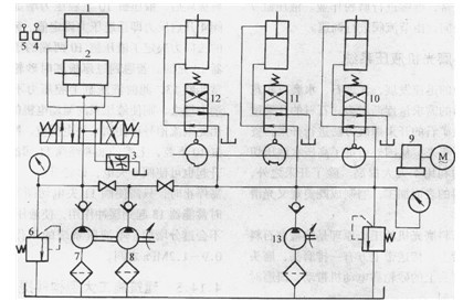 圖4為新型石料磨光機中的磨頭升降液壓系統(tǒng)。電動機啟動后,液壓泵2開始供油,電磁閥6得電后,油液進入液壓缸10上腔,砂輪快速下行。因有閥8和閥7形成的背壓,下行速度不致過快,此時彈簧式蓄能器13放油。當(dāng)砂輪接觸石料板坯后,液壓缸10上腔壓力增加,當(dāng)達到溢流閥4開啟壓力即系統(tǒng)壓力調(diào)定值。砂輪作用于板坯的法向力決定了液壓缸10兩端的壓差。此時蓄能器13充油。若遇到過厚板坯時砂輪被頂起,因有蓄能器13,此時液壓缸上腔壓力不會猛增。如切削力過大,則使液壓泵的驅(qū)動電機的電流過大,利用此電流信號可使閥6失電復(fù)位。則袖液進入液壓缸10下腔,上腔的油液經(jīng)腳ll同油箱。欲使磨頭升起也可使閥6失電,砂輪升起。上升到某一位置需停止時,只需使閥11失電切斷回油路即可,此時蓄能器13起到緩沖作用,使液壓缸10上腔壓力不會過分增加。本液壓系統(tǒng)的工作壓力需調(diào)定在0 9 -1.2MPa之間。