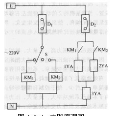 該液壓傳動系統(tǒng)由三個獨立的液壓站組成,每個液壓站對應(yīng)驅(qū)動一個液壓馬達,每個液壓馬達驅(qū)動一組鏈條,通過分別控制三組鏈條的進退速度來達到均勻進料的目的?,F(xiàn)以其中一組液壓回路來說明其工作原理。液壓原理見圖4.2-3、電氣原理見圖4.2-4。
