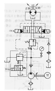 當電動機帶動液壓泵啟動后,開關(guān)S切向左側(cè)時,繼電器KM.觸點接通,電磁鐵3YA、1YA帶電,電液換向閥處于左位,順序閥在控制油的作用下導(dǎo)通,壓力油從油箱經(jīng)過濾器、液壓泵、單向閥、順序閥、換向閥至液壓馬達左側(cè)油口,推動馬達正轉(zhuǎn)?;赜蛣t從液壓馬達右側(cè)油口至換向閥、單向閥、冷卻器、過濾器、回到油箱;同樣,當開關(guān)S切向右側(cè)時,繼電器KM2觸點接通,電磁鐵2YA、3YA帶電,電液換向閥處于右位,壓力油進入液壓馬達的右側(cè)油口,推動馬達反轉(zhuǎn);當開關(guān)S切向中間位置時,電液換向閥處于中位,壓力油從換向閥的中位直接卸荷,馬達停止運轉(zhuǎn)。系統(tǒng)壓力由電磁溢流閥調(diào)節(jié),系統(tǒng)壓力值可以從壓力表中讀出。