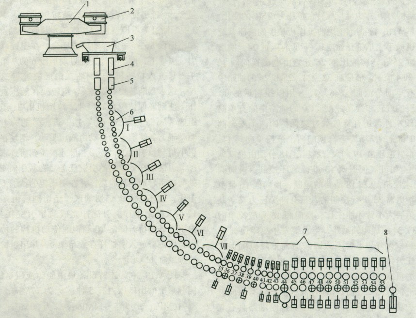 圖2所示為1600mm×250mm板坯連鑄主體設(shè)備工作示意圖。從煉鋼爐吊運來的兩個鋼水包2,放置于旋轉(zhuǎn)臺1上,輪流將鋼水注入中間缸3中,通過流量控制閘門,將鋼水澆注入結(jié)晶器4和格柵段5,經(jīng)一次冷卻形成坯殼。在引錠桿的牽引、引導(dǎo)下,向下移動,經(jīng)過扇形段6的7組輥架工~Ⅶ進(jìn)入拉矯機7。鋼坯在扇形段進(jìn)行二次冷卻,鋼水逐漸轉(zhuǎn)變成固態(tài)。7組輥架在液壓缸的動作下使鋼坯保持應(yīng)有的尺寸。拉矯機由21組輥子組成(從35號至55號),其中帶①號的為電動機驅(qū)動輥,各組輥子的移動由液壓驅(qū)動。鋼坯在拉矯機中得到拉引動力,外形和尺寸被矯到所要求的指標(biāo)。引錠桿在完成初始引錠任務(wù)后在脫引錠裝置8處與被引導(dǎo)的鋼坯脫離,并在驅(qū)動輥的拉引下連續(xù)工作,鋼坯進(jìn)入火焰切割區(qū),經(jīng)切割后由擺動輥12推入下道工序。引錠桿完成初始引錠任務(wù)后,由引錠桿斜橋升降缸10和鋼繩傳動機構(gòu)的協(xié)同工作將引錠桿放入引錠桿存放臺架9,并用引錠桿斜橋鎖緊缸11鎖定。