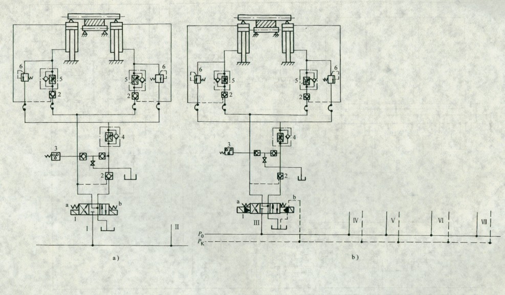 二次冷卻扇形段共分7段,每段上輥架的壓下和提升用液壓傳動。根據(jù)板坯厚度尺寸,液壓缸的壓下行程用增減液壓缸體下面的可以轉(zhuǎn)入或轉(zhuǎn)開的定距塊來定位。I、Ⅱ兩段上輥數(shù)均為5個,其上輥架的傳動系統(tǒng)完全相同如圖4中a所示;從Ⅲ段至Ⅶ段上輥數(shù)均為4個,每段上輥架的傳動系統(tǒng)也相同,如圖4所示。
