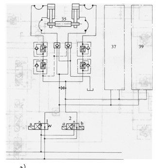 五個擺動輥的擺動缸可進(jìn)行單獨操縱,其液壓傳動回路完全相同。當(dāng)電液換向閥l的6端接電時,壓力油同時作用于擺動缸活塞的兩側(cè),活塞桿在差壓下伸出,使相應(yīng)的輥子擺下;當(dāng)電液換向閥1的a端接電時,擺動缸活塞桿退回,使相應(yīng)的輥子擺上;當(dāng)電液換向閥l的兩端都斷電時,通過液控單向閥4的作用,擺動輥可保持在任何預(yù)選定的位置上不動。輥子的擺動(或升、降)速度,由兩個單向可調(diào)節(jié)流閥2、3分別進(jìn)行調(diào)節(jié)。
