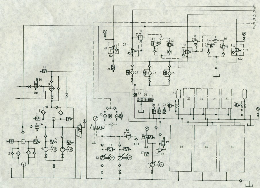 能源系統(tǒng)的出口壓力有5種:Po為17MPa; P1為8~16MPa; P2為5~14MPa; p3為20MPa;A為6MPa。低壓供油泵4為兩臺螺桿式泵,控制泵12為兩臺恒壓變量葉片泵,高壓工作泵16為4臺恒壓軸向柱塞變量泵,工作壓力為24MPa。在液壓箱1上裝有4個觸點的液位控制器,每個觸點代表一個液面位置而發(fā)出相應(yīng)的指令,用以監(jiān)控油箱中的油量,使液面在一定范圍內(nèi)工作。其中觸點A發(fā)出“液位太高”的警報信號,這可能是油中滲入了冷卻水,表明應(yīng)進(jìn)行排油;觸點B發(fā)出已達(dá)到容許的最高液位信號;觸點C發(fā)出已經(jīng)降低到容許的最低液位警報信號,表明應(yīng)補加液壓油;觸點D發(fā)出“液位太低”指令,所有的泵將關(guān)閉以保證系統(tǒng)安全。液壓油溫用油溫加熱、冷卻器9控制。壓力繼電器20、21、22用以控制主油泵的工作或卸載。兩臺低壓螺桿泵4向主油泵入口以1.5MPa的壓力供油,這樣可改善吸油條件。集中能源為了滿足不同用戶的需要,由高壓工作液壓泵輸出的24MPa壓力油,經(jīng)過不同的減壓調(diào)節(jié)裝置28、29、33、37后,將壓力分成四級輸出:壓力Po為經(jīng)減壓閥28后的二次壓力17MPa,供給扇形段上輥架液壓缸之用;壓力p.為經(jīng)過減壓閥29后的二次壓力8~16MPa,供拉矯機液壓缸送引錠時用。溢流閥30為限制壓力峰值之用;壓力P2為經(jīng)過減壓閥33后的二次壓力5~14MPa,供拉矯機液壓缸拉坯時用;壓力p3為經(jīng)過減壓閥37后的二次壓力20MPa,供給脫引錠裝置,引錠桿存放臺架斜橋的升降、鎖緊和火焰切割區(qū)擺動輥液壓缸之用。