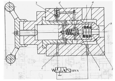 基于壓鑄成型下藝的特殊要求,壓射部分液壓管路的設(shè)計(jì)流速,一般可取25~30m/s,否則液壓管路和元件將變得十分龐大,使整個(gè)壓射機(jī)構(gòu)難于安排。蓄能器按絕熱狀態(tài)計(jì)算。方向閥要滿(mǎn)足快速啟動(dòng)和大流量的要求。第一級(jí)快速壓射閥34是普通插裝閥,第一級(jí)快速壓射閥是一種特殊結(jié)構(gòu)的插裝閥,它允許通過(guò)的壓力油的流量不低于4200L/min,具有快速啟動(dòng)和自動(dòng)關(guān)閉的性能,不需要大的先導(dǎo)閥控制,其結(jié)構(gòu)簡(jiǎn)圖見(jiàn)圖3。閥的a腔與壓射蓄能器22和31相通,b腔接壓射缸的無(wú)桿腔,當(dāng)先導(dǎo)電磁閥10YA動(dòng)作時(shí),c腔回油并向閥l左腔回油,其閥芯打開(kāi),d腔中的油流進(jìn)b腔。于是主閥芯2左移,使a腔接通,進(jìn)行快速壓射??靿荷浣Y(jié)束時(shí),10YA斷電,壓力油進(jìn)入c腔,一路關(guān)閉單向閥,另一路經(jīng)單向閥3進(jìn)入d腔關(guān)閉主閥芯2。