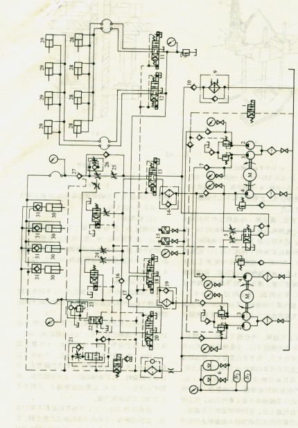 插銷缸29、28由中壓泵3供油,經(jīng)閥18左位、12、11至液壓缸29、28。液壓缸30的上下運動和液壓缸29、28的鎖放動作的協(xié)調(diào)配合,是借助電氣程序回路控制電液換向閥18、13、12、11來實現(xiàn)的。