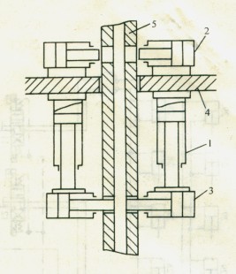 在圖4.9-3b中,缸體l與平臺4固結(jié),缸體2也和平臺固結(jié)。缸體3和缸體1活塞桿的一端固結(jié)。樁腿5降人海底的動作是:缸體2活塞桿自樁腿5徑向孔中退出(松開),缸體3活塞桿進(jìn)入樁腿徑向孔中(鎖緊),缸體1的活塞桿帶動樁腿下行,然后缸體2鎖緊,缸體3松開,缸體1的活塞復(fù)位。如此循環(huán),直到樁腿接觸海底。反之,可使平臺沿樁腿上升離開海面,到達(dá)一定的高度后,缸體2和3同時鎖緊,平臺可投入正常作業(yè)。