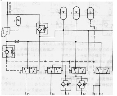 1、2、3、4-蓄能器 5-調(diào)壓減壓閥 6、7、8、9-液控?fù)Q向閥