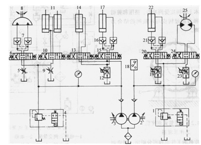 擺動(dòng)缸8是驅(qū)動(dòng)采集爪左右擺動(dòng)的,由電磁閥6來控制,單邊擺動(dòng)角度為135°,擺動(dòng)速度由節(jié)流閥5來調(diào)節(jié)。閥7、16、21為雙向液壓鎖,是使采集爪擺動(dòng)后定位之用的。缸11為采集爪開合缸,由電磁閥10來控制。最大開度為上下兩齒間距0.9m,由節(jié)流閥9來調(diào)節(jié)其開合時(shí)的運(yùn)動(dòng)速度。腕部缸14控制采集爪的俯仰,上下俯仰角可達(dá)90°。小臂缸17由電磁閥15來控制。由于腕部和小臂缸一般不同時(shí)工作,故采用同一電液比例調(diào)速閥12進(jìn)行控制。大臂缸22由電磁閥20來換向,由電液比例調(diào)速閥19進(jìn)行控制。從而構(gòu)成雙泵雙回路的電液比例控制系統(tǒng)。該系統(tǒng)負(fù)責(zé)控制工作中的小臂或大臂與腕部之間的協(xié)調(diào)動(dòng)作。回轉(zhuǎn)馬達(dá)25通過蝸輪蝸桿和齒輪齒圈減速器驅(qū)動(dòng)回轉(zhuǎn)盤并帶動(dòng)機(jī)械手左右回轉(zhuǎn)。它的工作速度由節(jié)流閥23來調(diào)節(jié),轉(zhuǎn)動(dòng)方向由電磁閥24來控制。壓力繼電器18是對大臂缸22進(jìn)行過載保護(hù)的,當(dāng)其作業(yè)過程中發(fā)生過載時(shí)即可發(fā)出電信號使泵卸載。