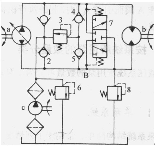 在發(fā)熱量較大的閉式系統(tǒng)中,為改善系統(tǒng)的散熱情況,需增加補油量,故增設(shè)低壓選擇閥(圖中的閥7),使系統(tǒng)經(jīng)常有部分低壓油經(jīng)閥7排回油箱。但此時輔助泵c的流量應(yīng)是主泵a的流量的20%~30%。