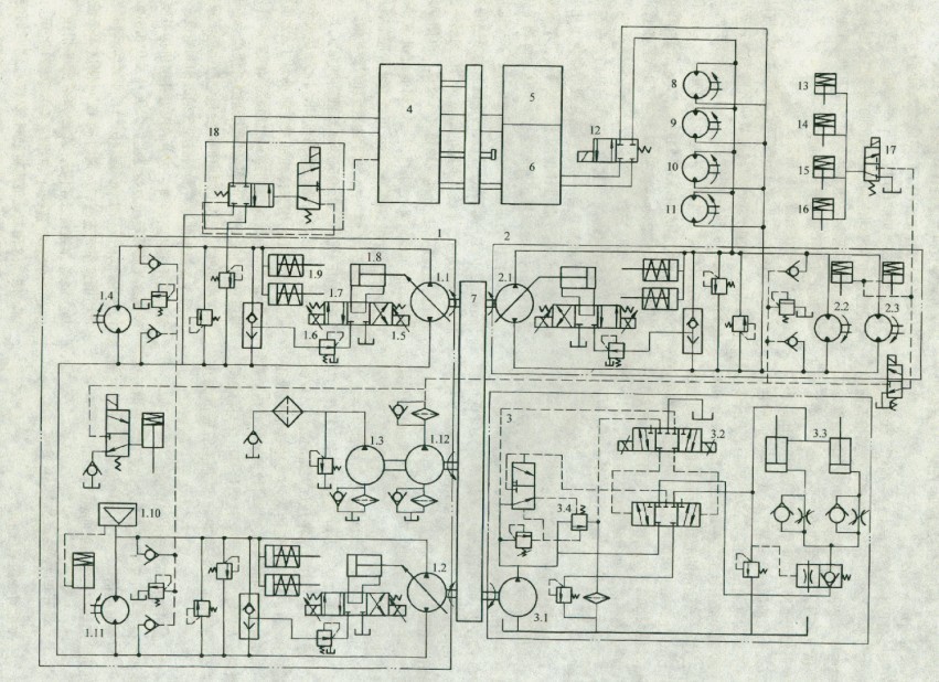 圖3是德國利布赫爾雙并回轉(zhuǎn)起貨機的液壓系統(tǒng)。圖中1是主回轉(zhuǎn)起貨機升降系統(tǒng);2是主回轉(zhuǎn)起貨機的回轉(zhuǎn)系統(tǒng);3是主叫轉(zhuǎn)起貨機的變幅系統(tǒng);4、5、6是副回轉(zhuǎn)起貨機的升降、回轉(zhuǎn)和變幅系統(tǒng),它們的油路分別和1、2、3完全相同。7是由電動機帶動的減速器,它同時帶動1.1、1.2、1.3、2.1、3_l五臺泵轉(zhuǎn)動。升降系統(tǒng)中的泵1.1和液壓馬達(dá)1.4構(gòu)成一個閉式油路。由液壓馬達(dá)1.4帶動起升卷筒使貨物起升或下降。用比例電磁鐵1.5、 1.6通過比例閥1.7控制泵1.1的變量機構(gòu)1.8,改變貨物升降速度。1.9是恒功率控制機構(gòu)。1 10為壓力記憶閥,其作用如下:重物懸吊在空中后,剎車液壓缸使閘塊抱緊。吊空的重物若再運動時,系統(tǒng)主回路的壓力必須達(dá)到前一次的壓力值,剎車缸才使閘塊松開。這樣,可使重物在第二次運動時不會下沉。記憶閥通過機械、電氣、液壓元件組成的一個系統(tǒng)可完成此種職能,即記憶閥可記憶前一次主回路達(dá)到的壓力值。泵1.2.液壓馬達(dá)1.11構(gòu)成的閉式油路和泵1.1.液壓馬達(dá)1.4形成的閉式油路全同,控制方式也相同。輔助泵1.3用來冷卻油液。輔助泵1 12是各控制油路(包括剎車油路)的油源。液壓泵21和液壓馬達(dá)2.2、2.3形成的閉式油路可使單臺回轉(zhuǎn)起貨機回轉(zhuǎn)。泵3.1排出的油經(jīng)過電磁比例流量方向閥3.2控制伸縮臂變幅缸3.3的方向和速度。它們構(gòu)成開式油路。閥3.2中的壓力補償機構(gòu)可使溢流閥3.4的開啟壓力始終比負(fù)載壓力大0.6MPa或1.2MPa。液壓馬達(dá)8、9、10、11可驅(qū)動雙回轉(zhuǎn)起貨機的工作底座回轉(zhuǎn)。通過閥12可使這4個液壓馬達(dá)或者和系統(tǒng)2相接,或者和系統(tǒng)5相接。閥18的功能是將系統(tǒng)1和系統(tǒng)4并聯(lián)或斷開。13、14、15、16使制動液壓缸通過閥17控制它們使閘塊放松或抱緊。