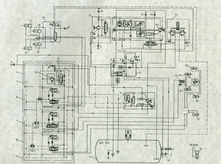 D8N型推土機(jī)美國(guó)卡特公司生產(chǎn)的一種重型全液壓推土機(jī)。該機(jī)所有可操作機(jī)具全部采用液壓傳動(dòng),具有輸出功率大、性能優(yōu)越、操作簡(jiǎn)單、運(yùn)動(dòng)靈活及工作效率高等特點(diǎn)。該推土機(jī)的液壓操縱系統(tǒng)主要由機(jī)具操縱和轉(zhuǎn)向系統(tǒng)這兩大系統(tǒng)組成。液壓系統(tǒng)原理圖如圖3所示。