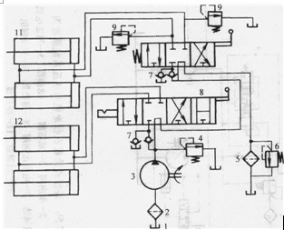 1- 油箱2-過(guò)濾器3一液壓泵4一溢流閥5-回油過(guò)濾器6-低壓溢流閥7一補(bǔ)油單向閥8一推土控制換向閥9一安全閥10一松土控制換向閥11-松土液壓缸12-推土液壓缸