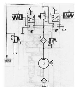 1-油箱2-過(guò)濾器3-液壓泵4-過(guò)濾器5一旁通閥6右離合器液壓缸7一右轉(zhuǎn)向控制閥8-主溢流閥9-左轉(zhuǎn)向控制閥 10-左離合器液壓缸11-潤(rùn)滑油溢流閥