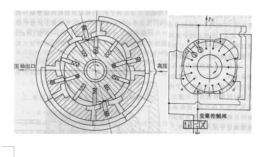 所有葉片根部都引入馬達(dá)進(jìn)口的高壓油。運轉(zhuǎn)時由彈簧和壓力油同時作用使葉頂緊貼定子內(nèi)表面,啟動時則靠彈簧將葉片頂出。如果,根部不引入壓力油,處在高壓油區(qū)的葉片將會在頂端壓力油的作用下被推離定子壓入轉(zhuǎn)子槽中。
