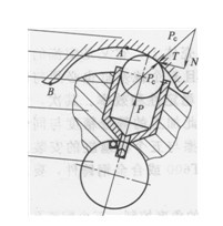 ①定子 如圖2所示,液壓馬達(dá)工作時,高壓油經(jīng)配流軸進(jìn)入鋼球下端油腔,壓力油形成液壓力P,將鋼球向上推,使它與內(nèi)曲線體的曲線接觸。在接觸點(diǎn)處,由力P形成的分力P。壓向內(nèi)曲線定子,它就給鋼球一個大小相等、方向相反的正壓力Pc,此力作用在鋼球上可分解為徑向分力N和切向分力T,其中徑向分力N與液壓力P相平衡,切向分力T通過鋼球作用在轉(zhuǎn)子4的切線方向,迫使轉(zhuǎn)子4沿逆時針方向轉(zhuǎn)動,轉(zhuǎn)子4直接與傳動軸相連,故使傳動軸轉(zhuǎn)動。由此可見,切向分力T的大小由定子內(nèi)曲線的形狀決定。而且由于鋼球與定子的接觸應(yīng)力要比一般的滾柱或橫梁與定子的接觸應(yīng)力大得多,故要求定子不但要有準(zhǔn)確的內(nèi)曲線形狀,而且必須具備高硬度、高耐磨、抗疲勞等性能。