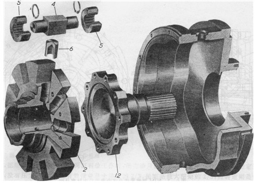 NJM型馬達柱塞6的頭部頂在橫梁4中間矩形截面部分的底部。橫梁在轉子2的槽內(nèi)沿徑向滑動,兩端各裝一個帶滾針軸承的滾輪5。殼體1(即定子)內(nèi)左右兩邊均有內(nèi)曲線導軌,分別和橫梁兩邊的滾輪接觸。轉子2和輸出軸12用螺釘連成一體,用滾動軸承7和14支承。配油軸套11裝在配油軸3的外面,它上面均布有12個長圓形的徑向孔d(見圖9-8),分別與配油軸上相應的進油和排油窗口對準,用圓柱銷9以保證其相對位置的準確。壓力油從配油軸上進油口口通到內(nèi)孔g,再從進油窗口c流入轉子中相應的柱塞孔中,如圖9-7主視圖的下面半個視圖所示。流入排油窗口e中的油液,向左流入配油軸上的環(huán)槽f中,再從排油口b中排出,如圖9-7主視圖的上面半個視圖所示。微調螺釘8的右端是一個偏心圓柱,它安裝在配油軸3左下方的叉口內(nèi),因此,轉動微調螺釘8,便能帶動配油軸作微小的轉動,以調整配油軸與定子之間的相對位置,保證配油位置的正確。
