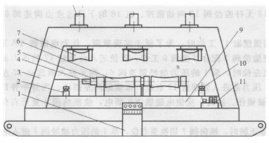 矯直機(jī)由主機(jī)、進(jìn)出料裝置及液壓和電控系統(tǒng)等組成。主機(jī)為框架式結(jié)構(gòu)(見(jiàn)圖4-15),機(jī)架3上方安裝有三個(gè)液壓缸8驅(qū)動(dòng)的矯直輥7。在底座的工作臺(tái)9上對(duì)應(yīng)安裝兩個(gè)與主機(jī)軸線(xiàn)成一定角度的下矯直輥6(由兩個(gè)液壓馬達(dá)4驅(qū)動(dòng))。輥?zhàn)拥哪妇€(xiàn)呈雙曲線(xiàn)形。在工作臺(tái)的兩端部還有兩個(gè)沖頭2和10,分別由兩個(gè)液壓缸驅(qū)動(dòng)。進(jìn)出料裝置分別設(shè)在矯直機(jī)的兩端,進(jìn)料裝置是將需要矯直的管材送人矯直機(jī)中。出料裝置是將矯直后的管材送到物料架中。它們均采用電動(dòng)機(jī)驅(qū)動(dòng)的滾道輸送管材。