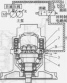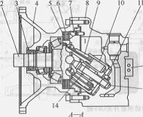 1-制動(dòng)彈簧;2-驅(qū)動(dòng)軸;3-隔環(huán);4,8-殼體;5-摩擦盤;6-摩擦片;7-制動(dòng)活塞;9-活塞;10 -油缸體;11-配流盤;12-回轉(zhuǎn)晃動(dòng)防止閥;13-中心軸;14 -中心彈簧;15 -安全閥;16 -單向閥;17 -單向閥彈簧}18-梭閥;19 -梭閥彈簧