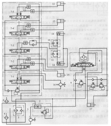 1-定量液壓泵;2-單路穩(wěn)定分流閥;3-油箱;4-吸油過濾器;5-帶旁通單向閥的精過濾器;6-空氣過濾器;7-三位六通多路換向閥;8-轉(zhuǎn)向控制閥(轉(zhuǎn)向器);9-單向溢流閥組; 10、11-單向節(jié)流器;12-喂入控制液壓缸;無級(jí)變速液壓缸;14-切割臺(tái)升降液壓缸; 15-柴油機(jī)離合器液壓缸;16-噴嘴擋板液壓馬達(dá);17-噴筒轉(zhuǎn)向液壓缸