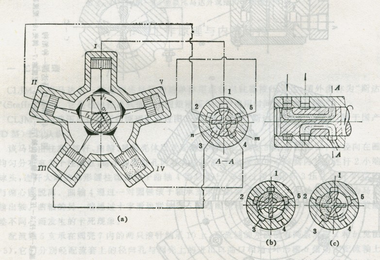 與傳統(tǒng)斯達(dá)法型馬達(dá)外形基本相同。其馬達(dá)的星形殼體4上有徑向布置的五個(gè)柱塞缸孔,每個(gè)缸孔中裝配一個(gè)活塞16,每個(gè)活塞16的球窩中部均鉸接著連桿17的球頭,球頭內(nèi)端的對(duì)開(kāi)式球頭座18,被卡在活塞槽孔內(nèi)的孔用彈簧擋圈19軸向定位,連桿大頭端的凹形圓弧面剛好與曲軸的曲軸頸吻合,五只連桿大端在曲軸頸的兩側(cè)分別各用一只抱環(huán)5箍牢,使得各缸連桿在回程工作時(shí)不與曲軸頸脫離。
