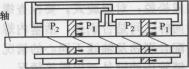 ②活塞螺旋式擺動液壓馬達 活塞與螺桿(輸出軸)組成螺旋副(圖9P13),當(dāng)壓力油從A口進入、B口回油時,推動兩活塞向左移動,根據(jù)螺桿螺母副的傳力和運動法則,當(dāng)螺母(此處為活塞)移動時,螺桿(此處為輸出軸)產(chǎn)生轉(zhuǎn)動;壓力油反向從B口進入時,活塞右行,輸出軸反向轉(zhuǎn)動。這種液壓擺動缸輸出轉(zhuǎn)矩大,運轉(zhuǎn)平穩(wěn),有導(dǎo)向桿導(dǎo)向。但螺紋副密封困難,內(nèi)泄漏大,只能用于低壓。