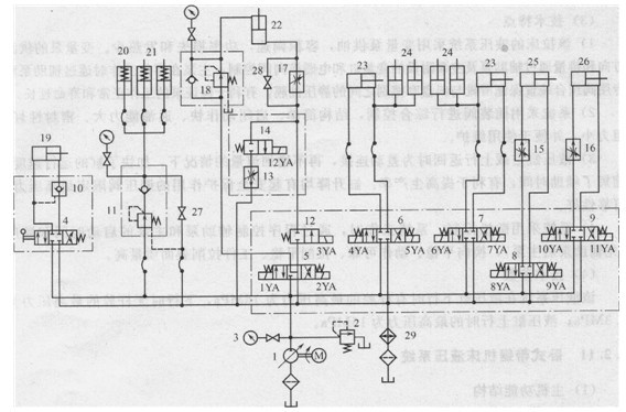1-限壓式變量叫片泵;2一溢流閥;3一壓力表;4三位四通手動換向閥; 5、6、7、8、9 -三位四通電磁換向閥;10-液控單向閥;11-減壓閥; 12、14-二位二通電磁換向閥;13、l5、16、17調(diào)速閥,18單向減壓閥; 19-鋸條張緊缸;20-導向機構(gòu)鎖緊缸;21鋸條導向缸;22一鋸架升降缸;z3夾緊缸(前后同); 24-頂起缸(前后同);25一前卸料缸;26后送料缸;27、28截止閣;29冷卻器