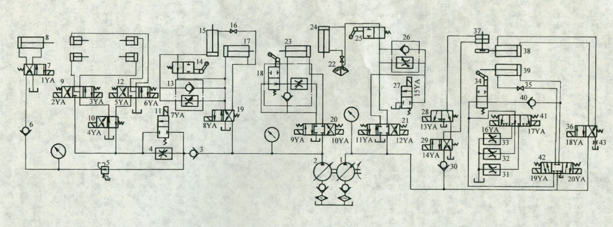 圖3示為雙泵供油系統(tǒng),低壓大流量泵2排油經(jīng)單向閥5與高壓小流量泵l排油匯合一處,經(jīng)過濾器6、單向閥7向系統(tǒng)各運(yùn)動機(jī)構(gòu)提供壓力油,系統(tǒng)壓力由溢流閥28調(diào)定并保持。