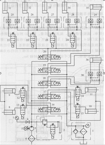 1-回油過(guò)濾器;2-電磁溢流閥;3-齒輪泵;4-網(wǎng)式吸油過(guò)濾器;5-電動(dòng)機(jī);6-壓力表開(kāi)關(guān);7壓力表8、9、10、11-側(cè)向液壓缸12、13、14、15、21、22、23、24二位二通電磁換向閥;16、17、18、19、20-三位四通電磁換向閥;25、26、27、28、29、30-雙向液壓鎖; 31、32、33、34-豎向液壓缸;35、36-水平液壓缸