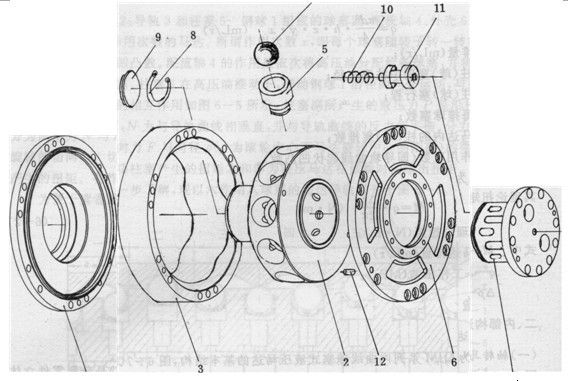 1-鋼球,2-帶輸出軸的缸體;3-導(dǎo)軌i4-配流軸;5一柱塞}6一后蓋; 7-前端蓋;8-孔用擋圈I9一封油悶頭;10-彈簧,11-變速閥}12-定位銷