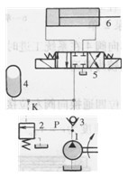 這種快速運動回路適用于短時內需要大流量、又希望以較小流量的泵提供較高速度的快速運動場合。但是系統(tǒng)在其整個工作循環(huán)內必須有足夠長的停歇時間,以使液壓泵能對蓄能器充分地進行充油。