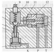 這種回路中卸荷閥的結構是專門設計的(見圖9-llb),它與一般先導式壓力閥不同。其導閥8除了受彈簧10的力和b腔處液壓力作用外,還要承受柱塞7的推力。當蓄能器開始充油時,卸荷閥中的導閥8和主閥12都處于關閉位置,油腔a和b處的壓力都等于泵壓,柱塞兩端液壓力平衡,對導閥不產生推力。隨著進入蓄能器油液的不斷增多,油腔a和b中的壓力亦不斷升高;當壓力升高到b腔的液壓力能克服導閥彈簧力,將導閥打開時,P口處來的壓力油便經阻尼孔14、導閥閥口、主閥中心孔13和通口T流回油箱。由于阻尼孔的作用,b腔壓力小于泵壓,這使主閥閥口打開,泵開始卸荷。此時b腔壓力小于a腔壓力。柱塞便對導閥施加一額外的推力,促使導閥和主閥的閥口都開得更大,結果使b腔壓力下降到零,柱塞處于其最上端位置。由于a腔的工作面積比b腔大,因此蓄能器中的壓力即使因泄漏而有所下降,卸荷閥仍能使泵處于卸荷狀態(tài)。蓄能器所能達到的最高壓力由調節(jié)螺釘9調定。