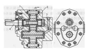 圖1固定間隙的齒輪液壓馬達(dá)結(jié)構(gòu) 1,2-側(cè)板;3-泄漏油孔;4-輸出軸