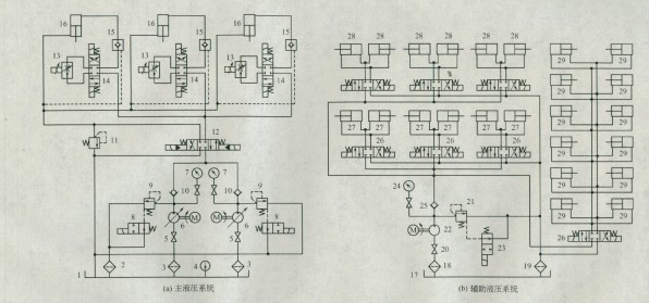 圖3-10 (b)所示為輔助液壓系統(tǒng),它由單定量泵22供油,泵的壓力和卸荷由溢流閥21和二位二通電磁換向閥23控制,系統(tǒng)壓力由壓力表及其開關24顯示;3組(6個)并聯(lián)的上插銷液壓缸、3組(6個)并聯(lián)的下插銷液壓缸和6組(12個)液壓缸的往復運動由各三位四通電磁換向閥26控制。