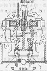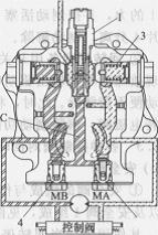 如果油口MB的壓力變得高于油口MA的壓力,它就會(huì)推壓梭閥4 (A),油腔C就變得與油口MB的壓力相同并繼續(xù)升高至溢流閥1的設(shè)定壓力。因此,一個(gè)高的制動(dòng)力矩作用在馬達(dá)上,使馬達(dá)停止轉(zhuǎn)動(dòng)。