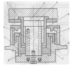 1-小缸缸筒;2一活塞桿;3-大缸;4-機架5-調(diào)節(jié)螺母;6-活塞; a、b、d-油腔;c一壓縮空氣腔